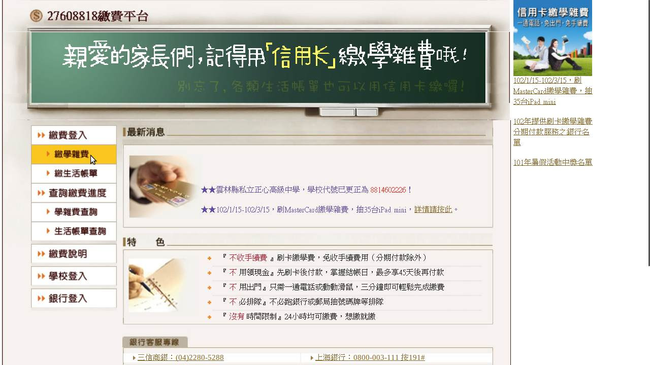 1. 台灣的27608818網上信用卡交學費平台只接受台灣信用卡,初到台灣時因為未有台灣信用卡,通常會用現金交第一次學費